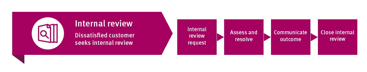 A process conducted by appropriately trained departmental staff on request from the complainant which examines if the complaint management process for the original customer complaint was appropriate and/or if the outcome reached was reasonable. An internal review is not a re-investigation of the original customer complaint.