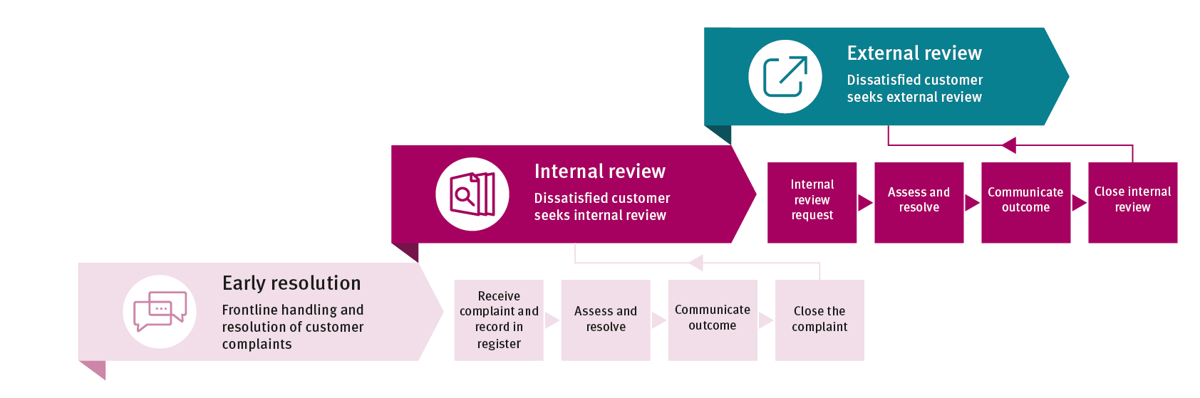 A process conducted by appropriately trained departmental staff on request from the complainant which examines if the complaint management process for the original customer complaint was appropriate and/or if the outcome reached was reasonable. An internal review is not a re-investigation of the original customer complaint.